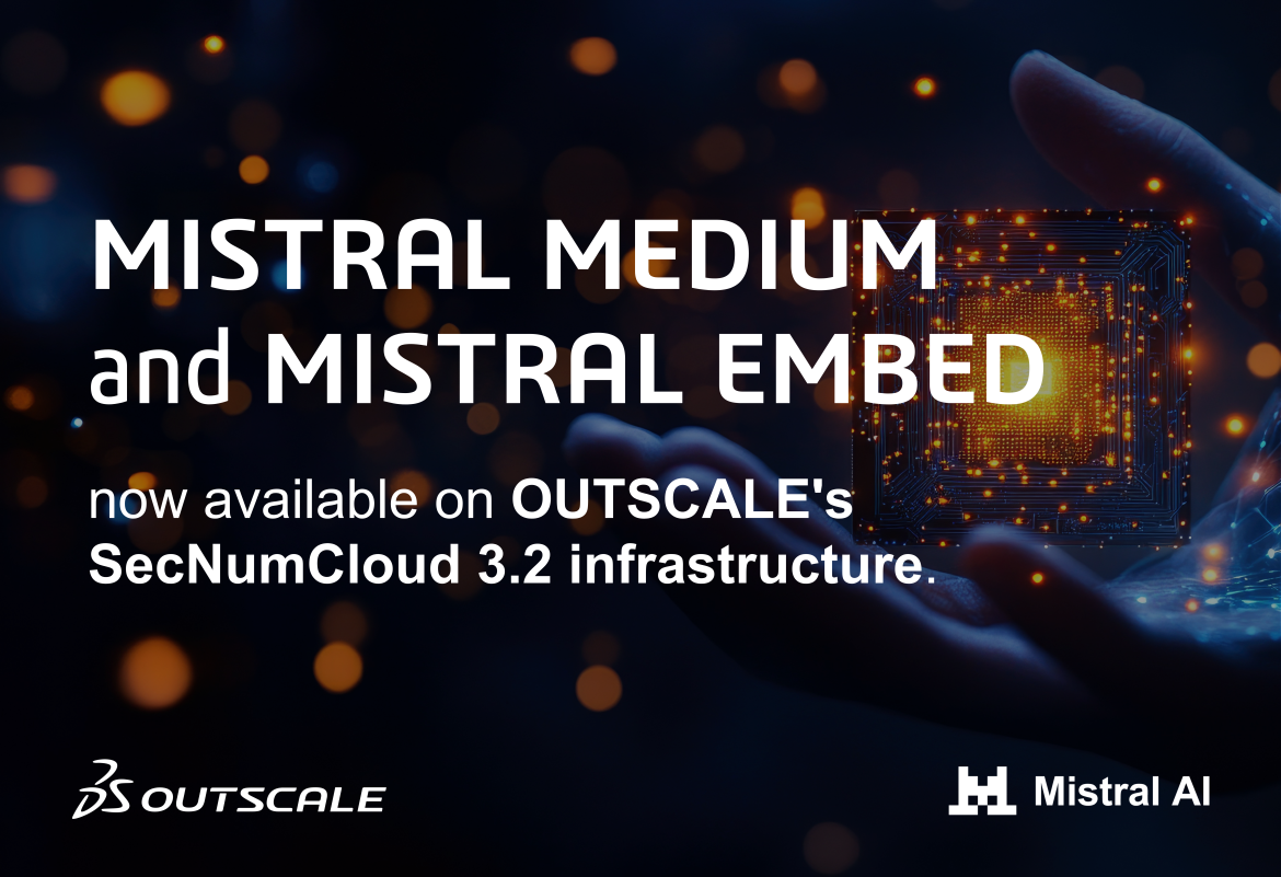 OUTSCALE, a Dassault Systèmes brand and the only public Cloud operator qualified SecNumCloud 3.2, enriches its offering with Mistral AI. We are proud to announce the deployment of Mistral Embed and Mistral Medium on our sovereign infrastructure, offering French companies and institutions leading AI capabilities in a secure and sovereign environment.