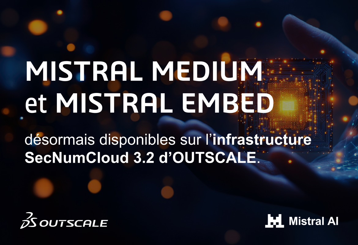 OUTSCALE, marque de Dassault Systèmes et unique opérateur Cloud public qualifié SecNumCloud 3.2, enrichit son offre avec Mistral AI. Nous sommes fiers d’annoncer le déploiement de Mistral Embed et Mistral Medium sur notre infrastructure souveraine, offrant aux entreprises et institutions françaises des capacités d’IA de premier plan dans un environnement sécurisé et souverain.